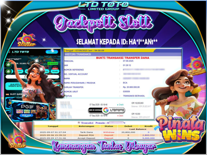 Selamat kepada User id : HA*I**AN1** Telah berhasil mendapatkan kemenangan besar pada permainan PINATA WINS, kemenangan Sebesar Rp.20.800.000, Setelah mengisi formulir withdraw dengan kurang waktu hanya 5 – 10 menit pihak LTDTOTO sudah melakukan transfer kepada pemilik User id dan dana sudah dapat di cairkan oleh pemenang. Bukti pembayaran yang kami berikan merupakan bukti pembayaran yang SAH / VALID yang langung di dapatkan melaui tanda transfer transaksi dari Bank yang di tuju. Kami mengucapakan banyak Terima Kasih Kepada pemenang karena sudah mempercayakan kami sebagai Bandar Tepercaya yang membayar semua kemenangan member hingga lunas. Masih ragu dengan LTDTOTO bos ? Di mana bandar togel online sekarang yang terpercaya seperti LTDTOTO? Bandar yang mengirimkan kemenangan member tanpa bertele – tele. Jadi…. tidak perlu khwatir pada situs LTDTOTO karena kemenangan anda berapapun akan dibayarakan hingga lunas kepada pemenang.